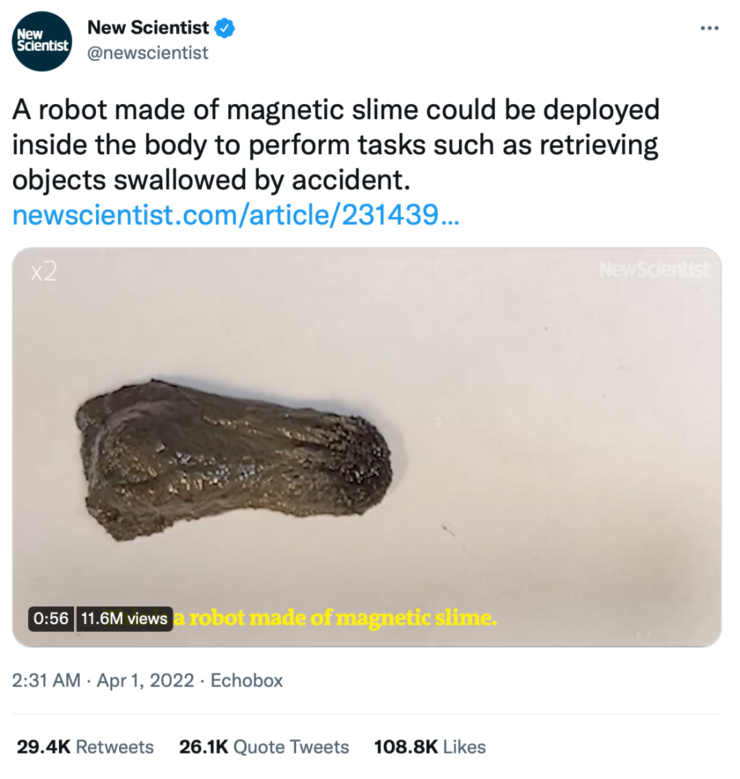 它是由磁性粘液材料制作而成,可以进入体内,取出意外吞噬的小器件。4月1日一发布,立即在科技社区引起巨大轰动,网友纷纷惊掉下巴,浏览点击率迅速超过十万、百万、千万: