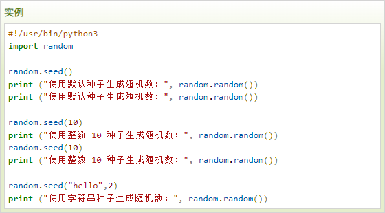 seed() 方法改变随机数生成器的种子,可以在调用其他随机模块函数之前调用此函数。